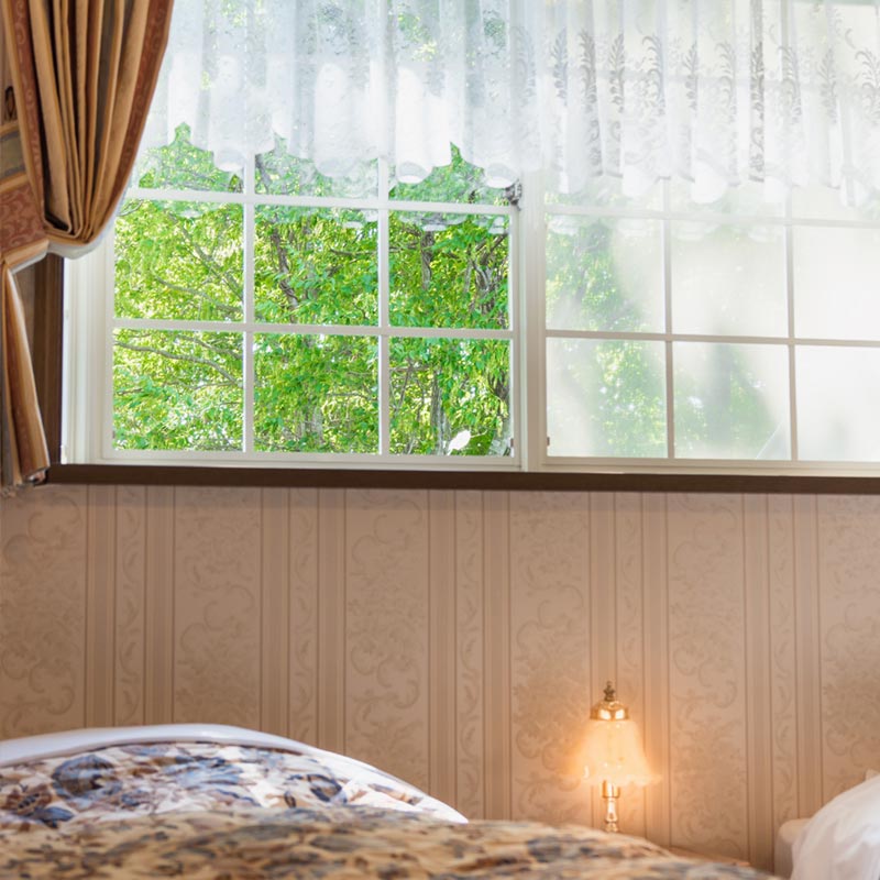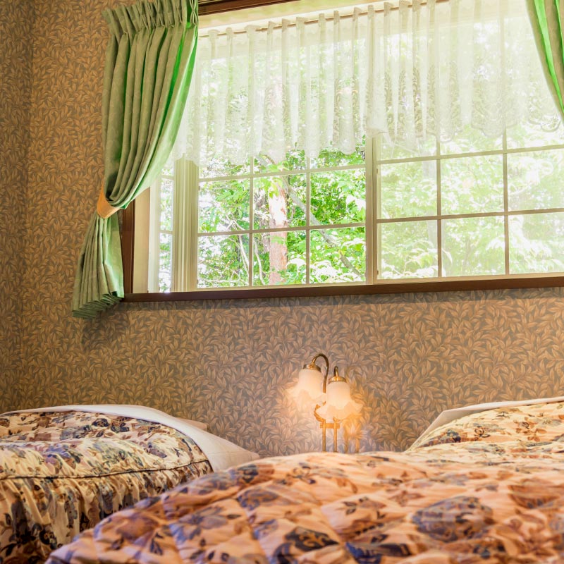 大きな出窓がロマンチックな客室からは、那須岳や湯川渓流の雄大な眺めが満喫でき、川のせせらぎがとっても心地良いです。
